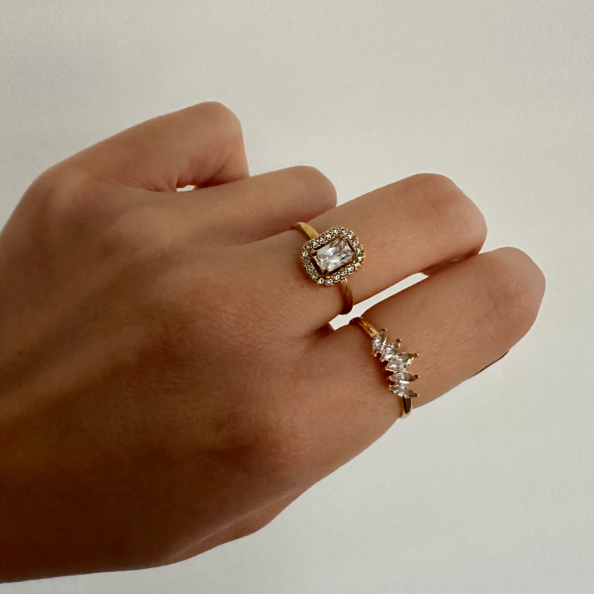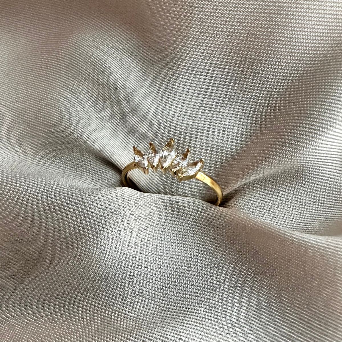 Este anillo con piedras blancas está diseñado para darle un toque elegante y luminoso a la imprescindible tendencia de joyas doradas. Atemporal, versátil y perfecto para combinar con cualquier estilo.