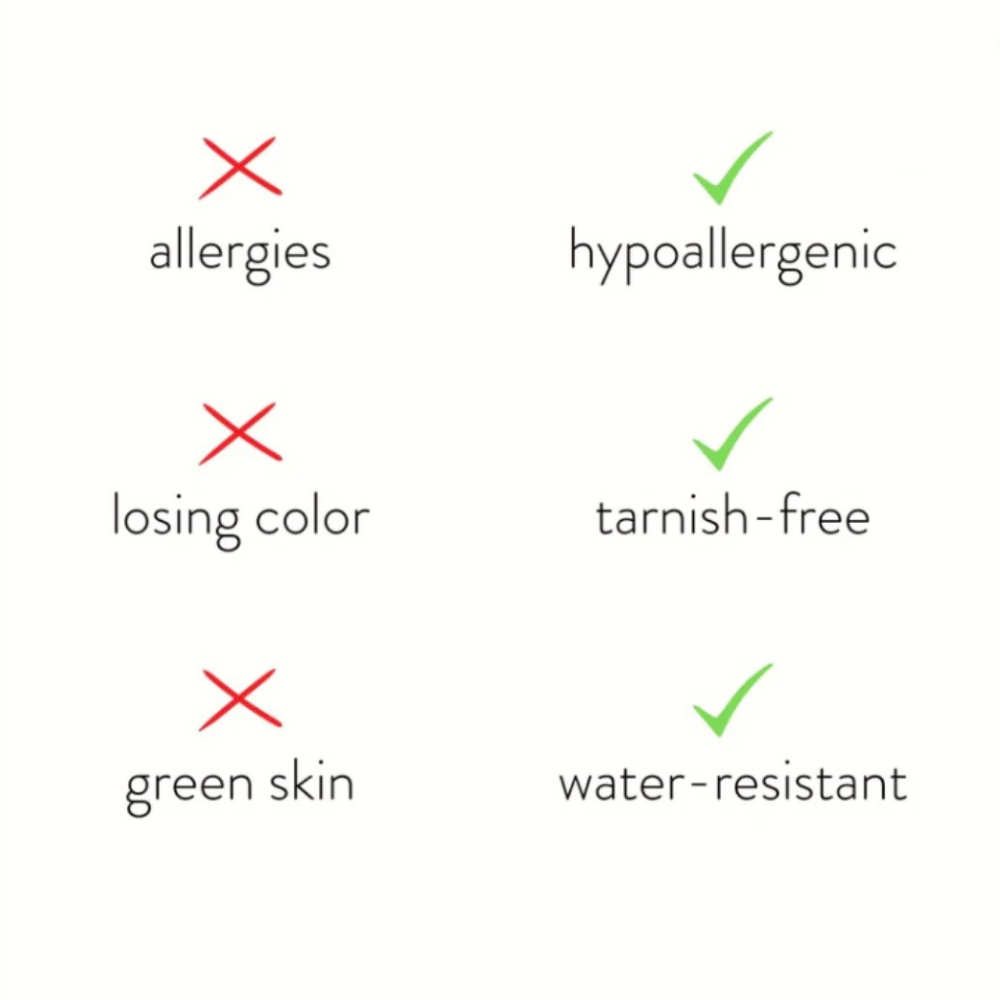 Fabricado en acero inoxidable impermeable, ya no tendrás que preocuparte por los dedos verdes, la decoloración ni el deslustre de tus joyas.